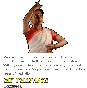 Mohiniyattam to me is a journey inward. Dance revealed to me the truth and cause of my existence. With my dance I touch the soul of nature, and it binds me to the cosmos. My passion elevates my dance to a realm of meditation.