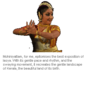 Mohiniyattam, for me, epitomises the best exposition of lasya. With its gentle pace and rhythm, and the swaying movement, it recreates the gentle landscape of Kerala, the beautiful land of its birth.