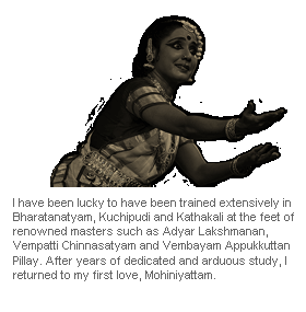 I have been lucky to have been trained extensively in Bharatanatyam, Kuchipudi and Kathakali at the feet of renowned masters such as Adyar Lakshmanan, Vempatti Chinnasatyam and Vembayam Appukkuttan Pillay. After years of dedicated and arduous study, I returned to my first love, Mohiniyattam.