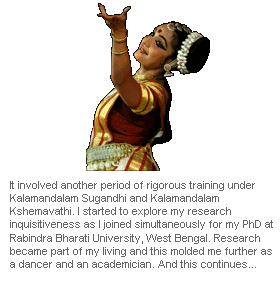 It involved another period of rigorous training under Kalamandalam Sugandhi and Kalamandalam Kshemavathi. I started to explore my research inquisitiveness as I joined simultaneously for my PhD at Rabindra Bharati University, West Bengal. Research became part of my living and this molded me further as a dancer and an academician. And this continues...