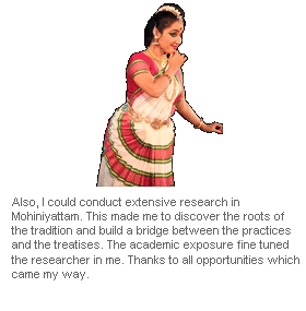 Also, I could conduct extensive research in Mohiniyattam. This made me to discover the roots of the tradition and build a bridge between the practices and the treatises. The academic exposure fine tuned the researcher in me. Thanks to all opportunities which came my way.