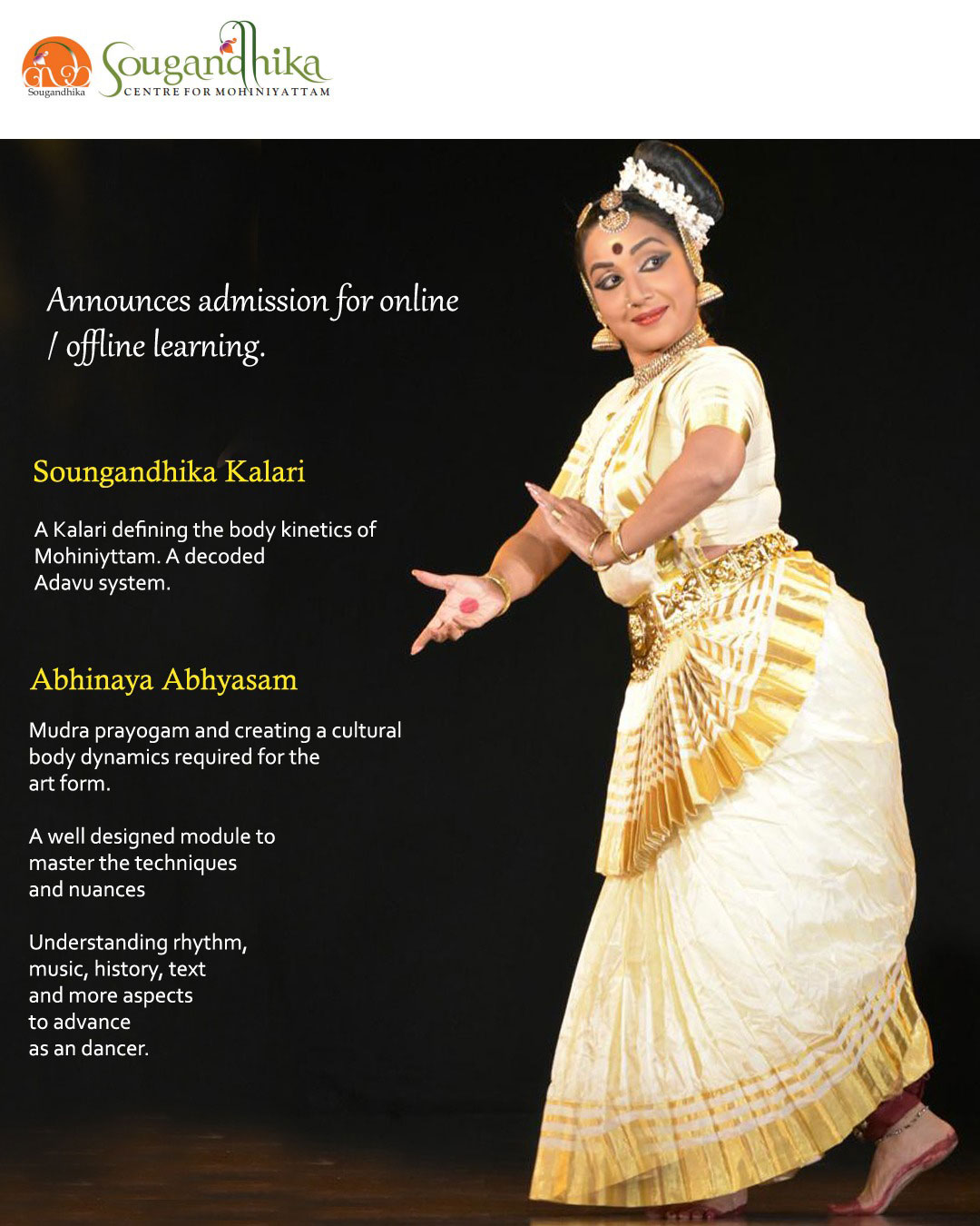 Sougandhika Centre for Mohiniyattam, which was established in 2003, has grown to a Premier institute, imparting training in Mohiniyattam to a group of dedicated students.
